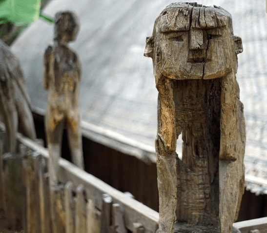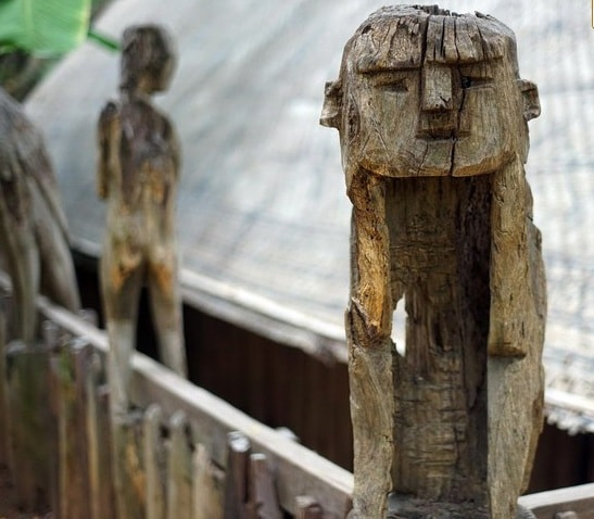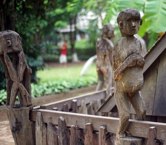 Nhà mồ được bao bằng một hàng rào tượng, được đẽo và tạc bằng rìu, đục và dao. Những tượng trai gái giao hoan, phô ra bộ phận sinh dục và tượng phụ nữ mang thai liên quan đến sự sinh sôi. Mái nhà lợp gỗ ván và được phủ một lớp phên nan tre có trang trí nhiều hình vẽ bằng phẩm màu đỏ tự chế tác theo lối cổ truyền. Những hình tạc trên nóc mô tả chủ yếu sinh hoạt lễ bỏ mả.