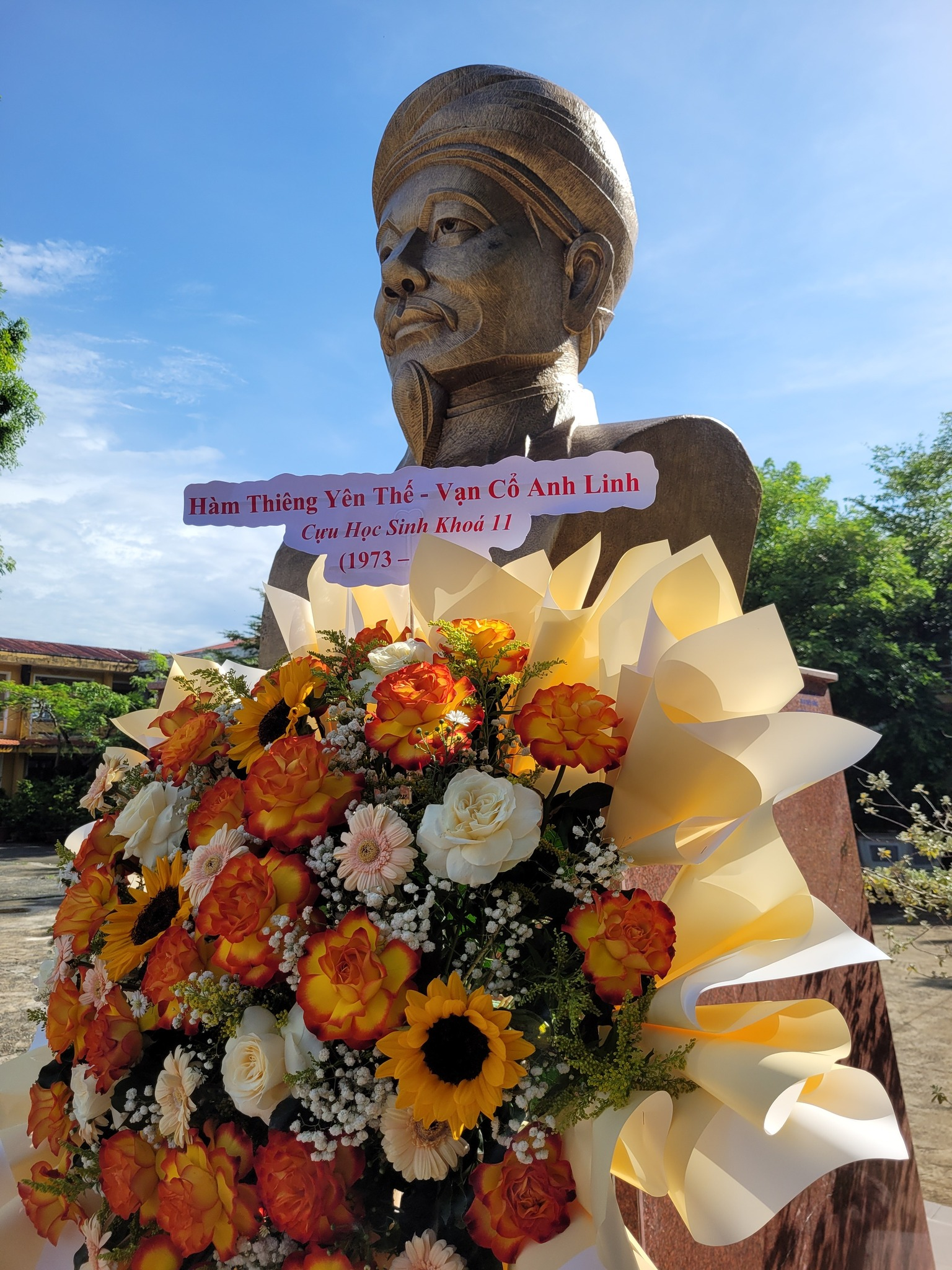 Tất cả cùng làm Lễ dâng hương trước tượng đài Hoàng Hoa Thám, người anh hùng kiệt xuất trường ta vinh dự được mang tên. Tên tuổi của người còn mãi như dòng chữ các em tôn vinh trên lẵng hoa tươi: