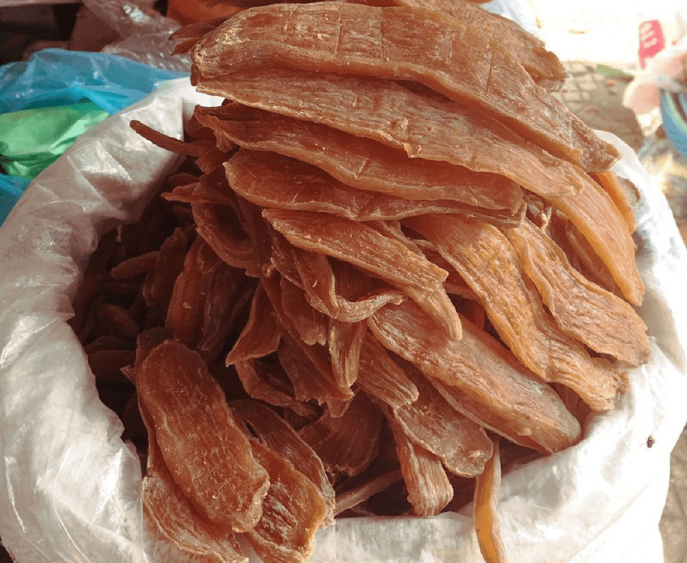 Nấu xong để cho khoai nguội, rồi đem chẻ thành từng lát mỏng, dọc theo củ khoai. Xong đem phơi cho thật khô. Bỏ khoai vào bao ni lông cột kĩ. Khi ăn lấy ra nhai như kẹo… Chewingum.